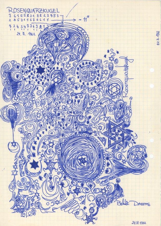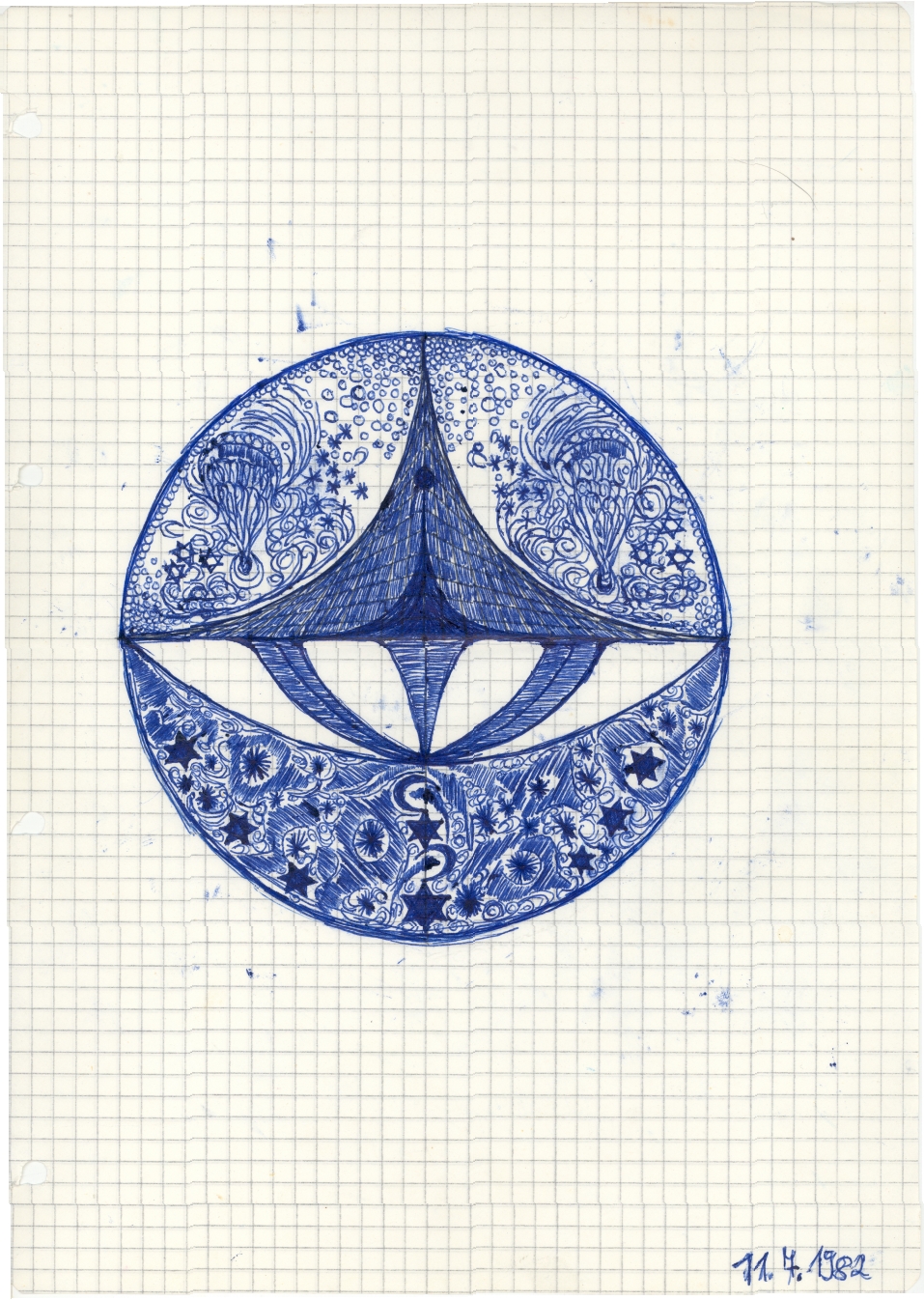 Objectbeschreibung: Kugelschreiber auf Notizblockpapier (kariert und gelocht). 21 cm auf 29,5 cm unsigniert, 22. 8. 1982/24. 8. 1982