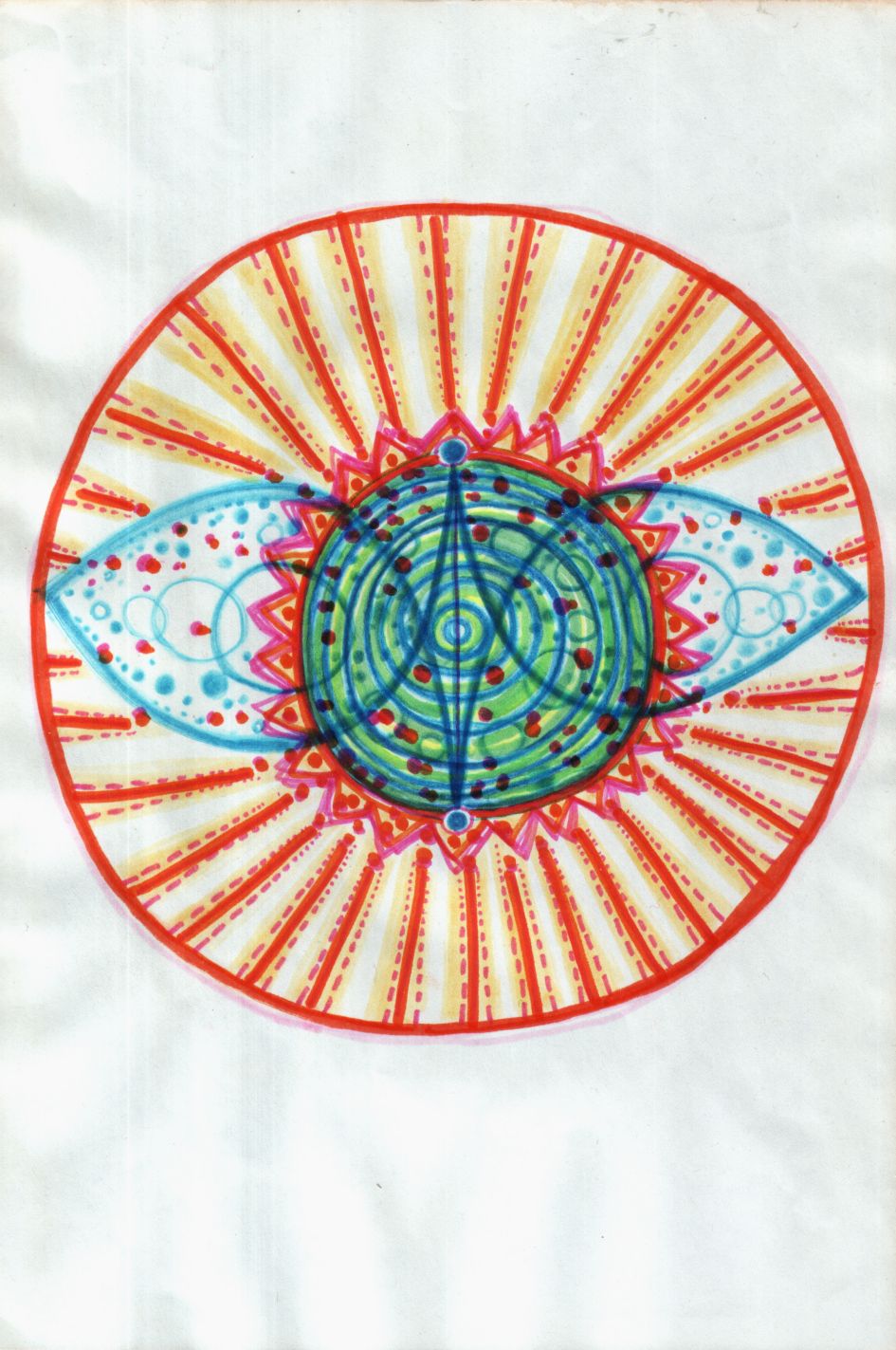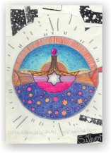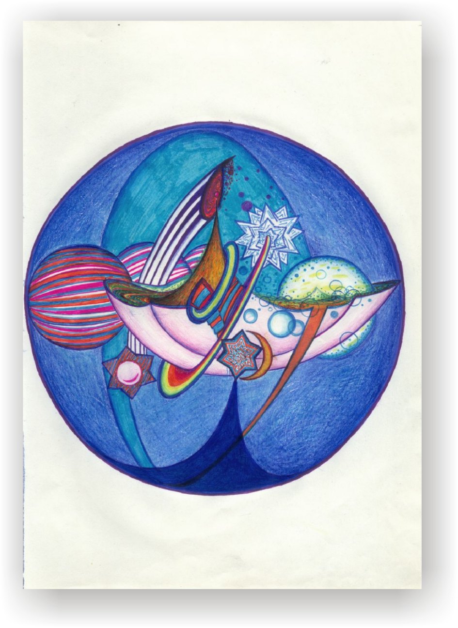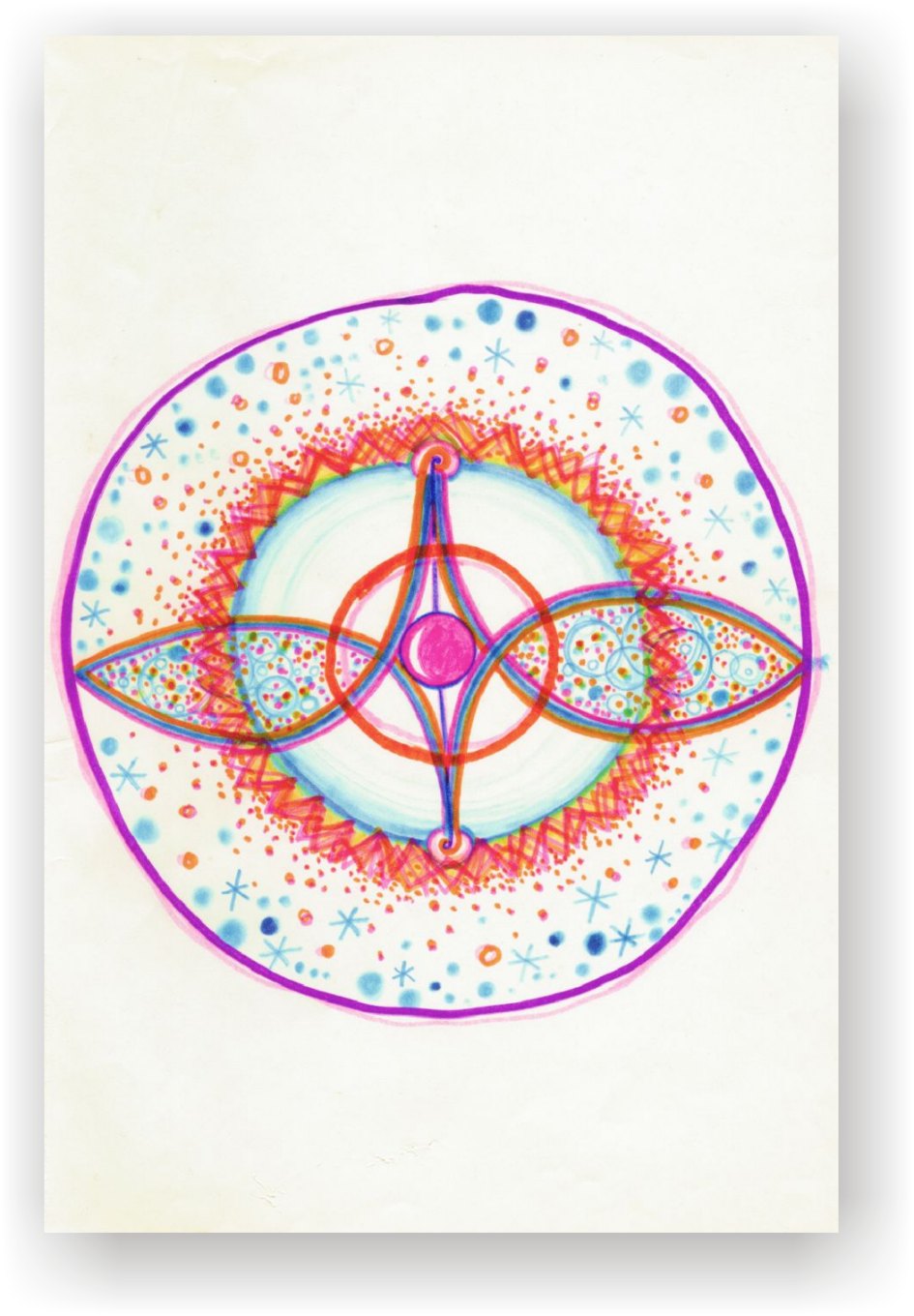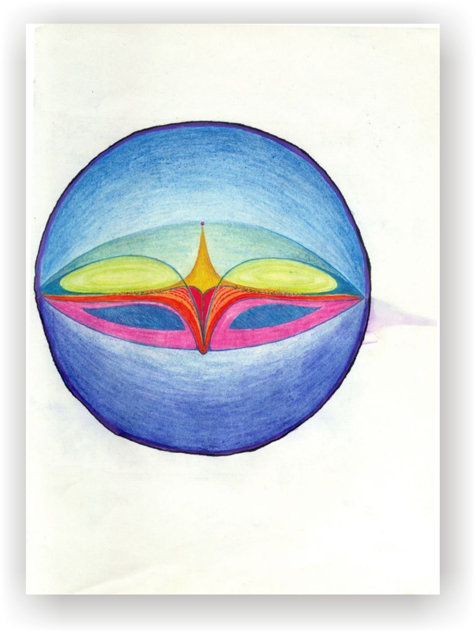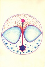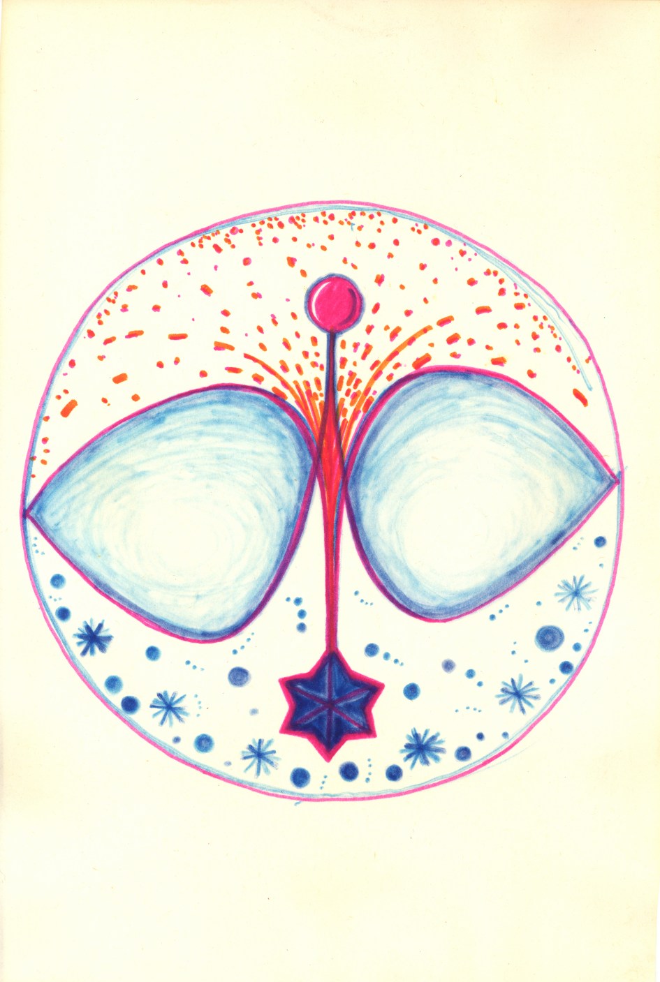 Objectbeschreibung: Buntstiftzeichnung mit einigen wenigen Collageteilen am Bildrand. (Blatt aus Skizzenbuch) 29,4 cm auf 20,5 cm unsigniert, 1988