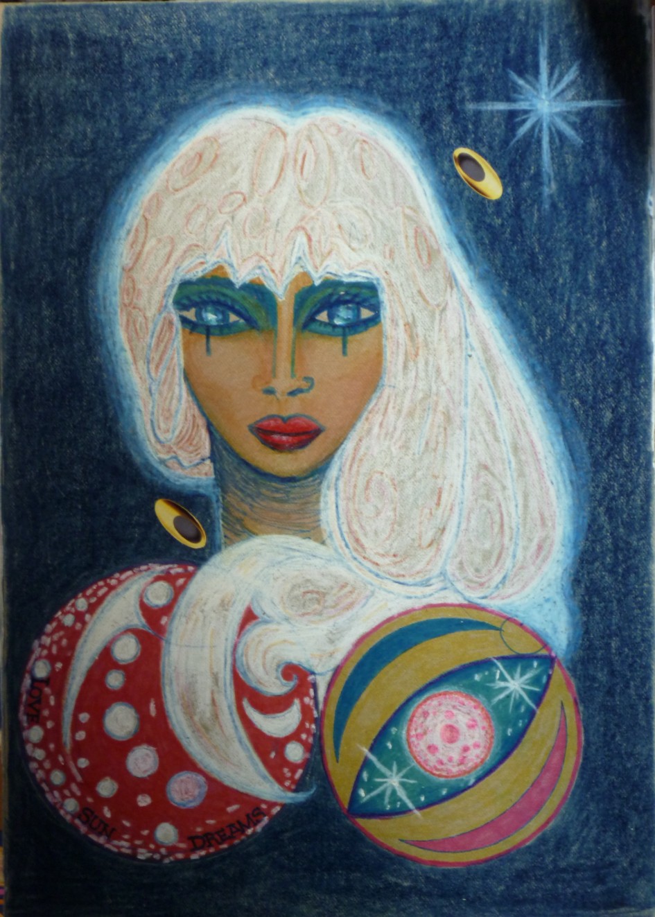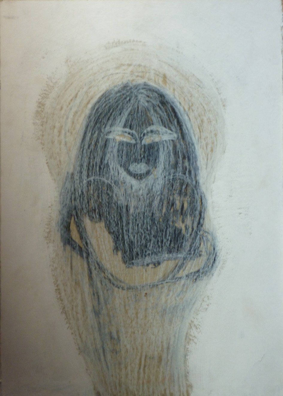 Objectbeschreibung: Wachskreide, Filzstifte, Collageelement und Makeup auf Graupappe. 42 cm auf 59,5 cm unsigniert, 1988
