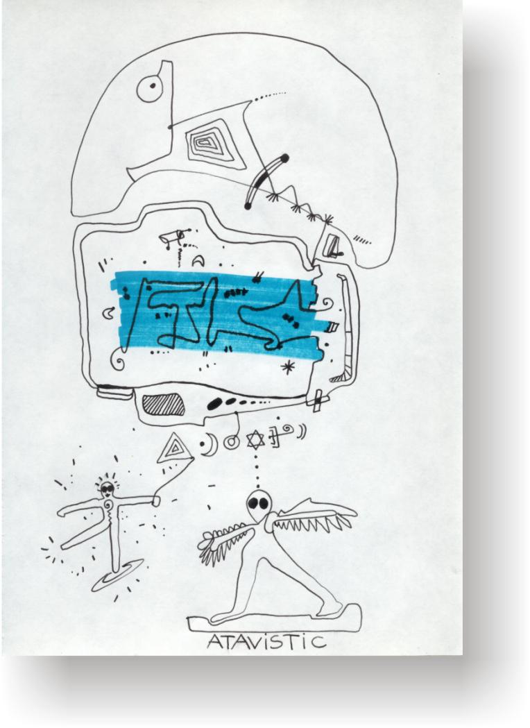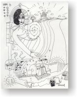 Objectbeschreibung: Tusche, Buntstifte, Kugelfüller, Bleistift auf Papier (Blatt aus Skizzenbuch). 20,7 cm auf 29,5 cm unsigniert, 1990