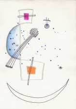 Objectbeschreibung: Tusche, Neonbuntstift und Wachskreide auf Papier (Blatt aus Skizzenbuch). 19,8 cm auf 29,5 cm unsigniert, 1990
