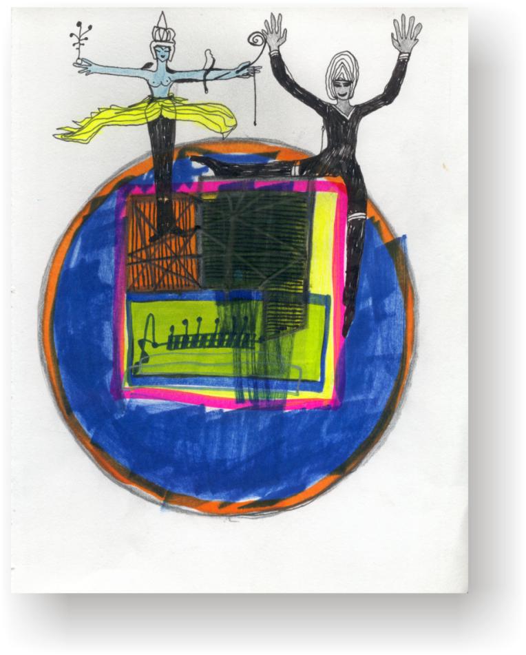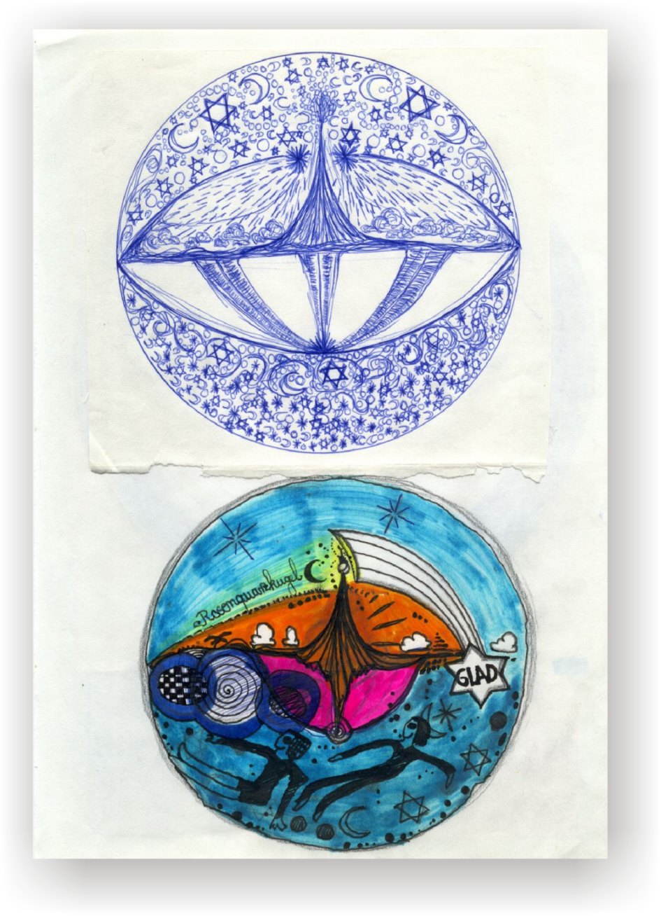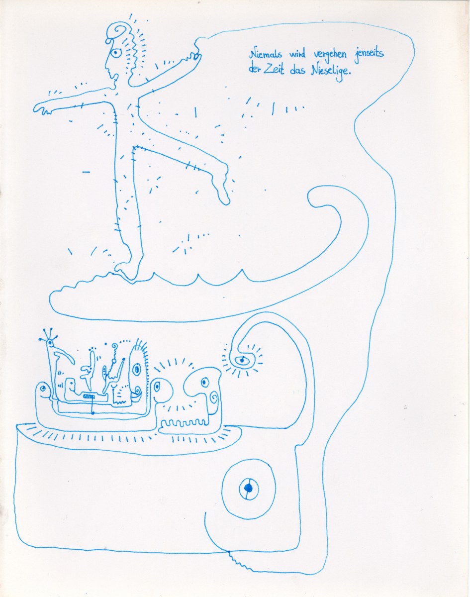 Objectbeschreibung: Oberes Bild: Kugelschreiber auf Papier, unsigniert 1982 (nachträglich ins Skizzenbuch von 1991 eingeklebt). Unteres Bild: Filzstifte und Tusche (Blatt aus Skizzenbuch). 29,4 cm auf 20,7 cm unsigniert, 1991