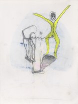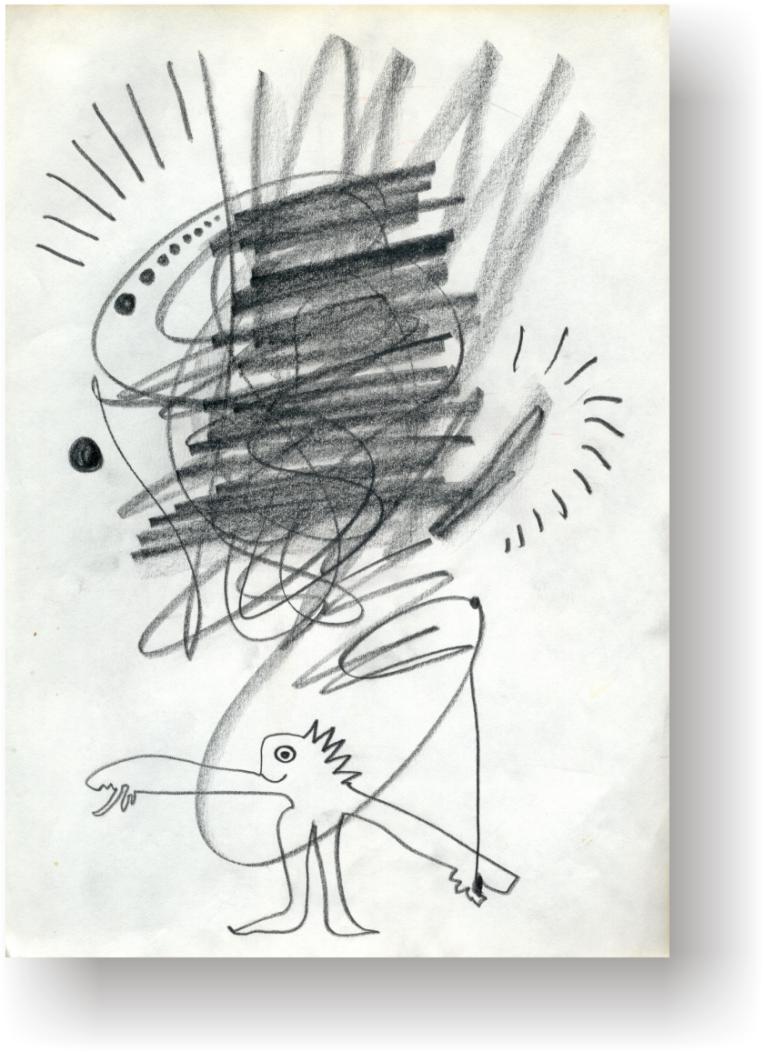 Objectbeschreibung: Bleistift, Tusche, Wachskreide und Graphikmarker auf Papier. (Blatt aus Skizzenbuch) 27 cm auf 21 cm unsigniert, 1991