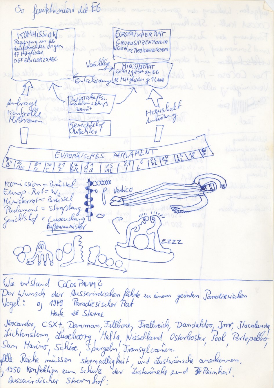 Objectbeschreibung: Kugelschreiber auf Papier. (Blatt aus Skizzenbuch) 29,4 cm auf 19,9 cm unsigniert, 1992 Werkeverz.: PAP/”Angeregtes ReBoRe-Cocos*Palam”/294*199*0*/191