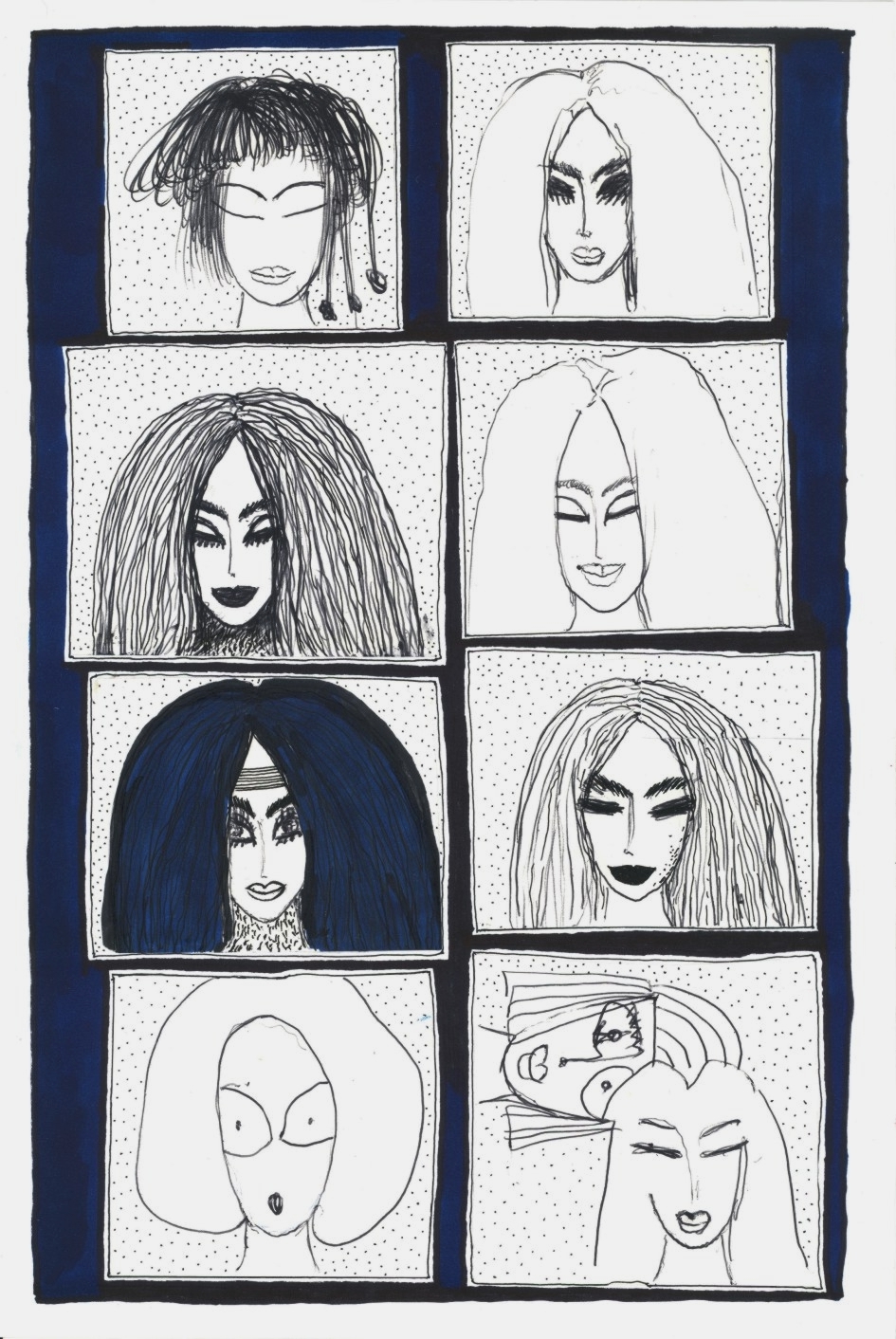Objectbeschreibung: Mit Rapidograph und Filzstift überarbeitetes Originalblatt aus einem Modemagazin (plus Collageelemente). 20 cm auf 29,5 cm unsigniert, 1997