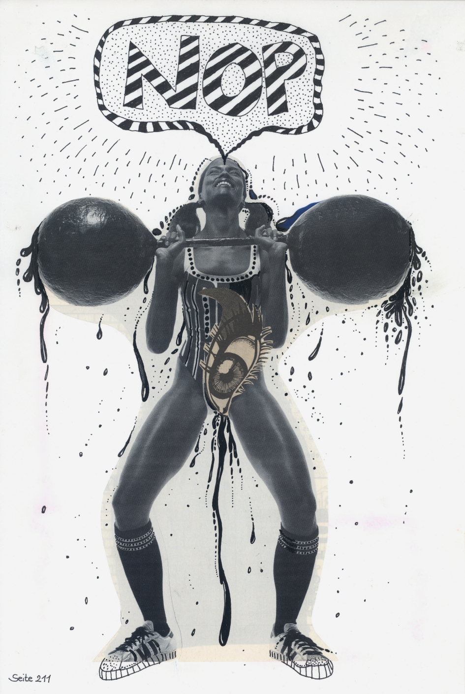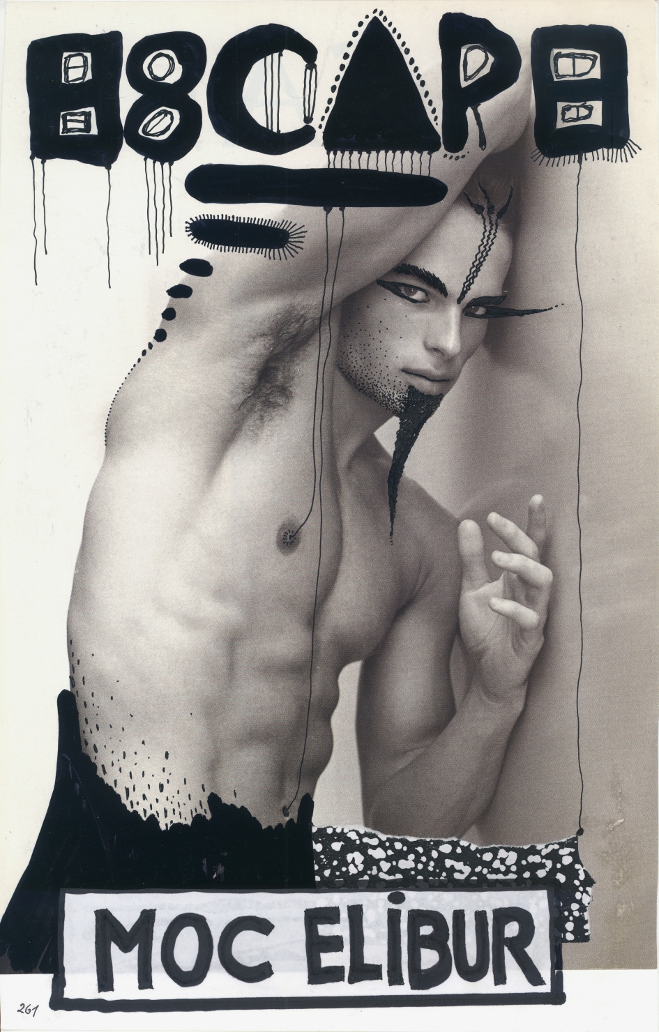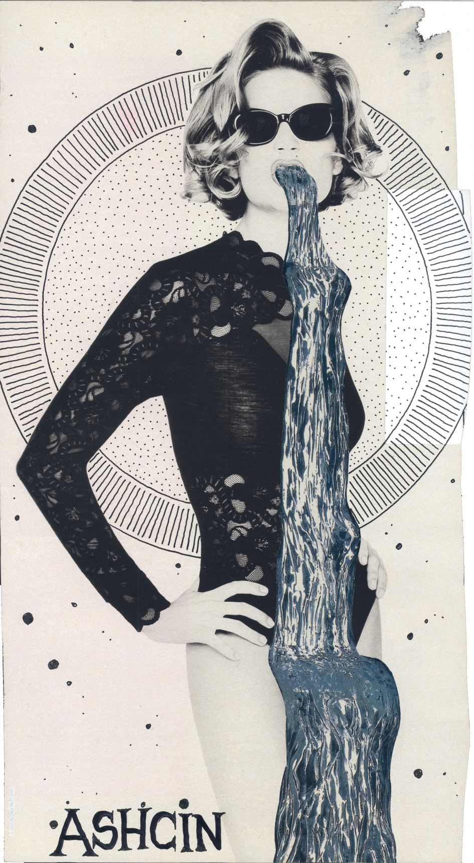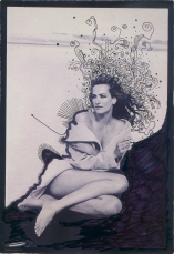 Objectbeschreibung: Mit Rapidograph, Filzstift und Lackstift überarbeitetes Originalblatt aus einem Modemagazin (plus Collageelemente). 19 cm auf 29,6 cm unsigniert, 1997