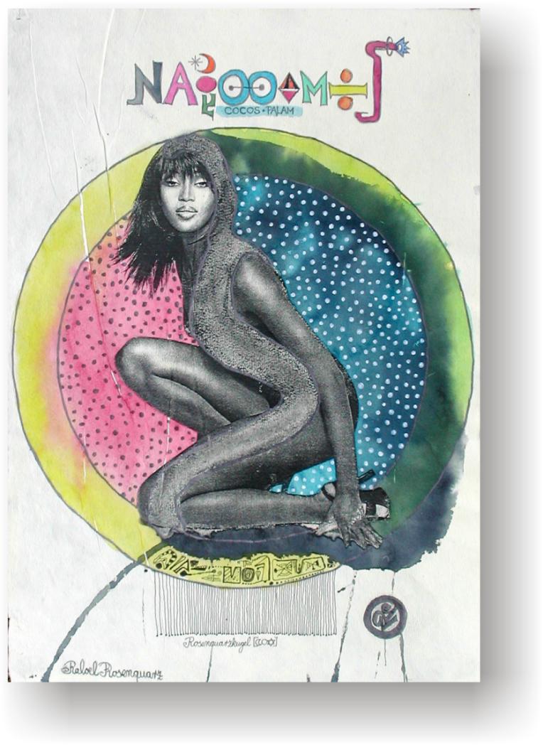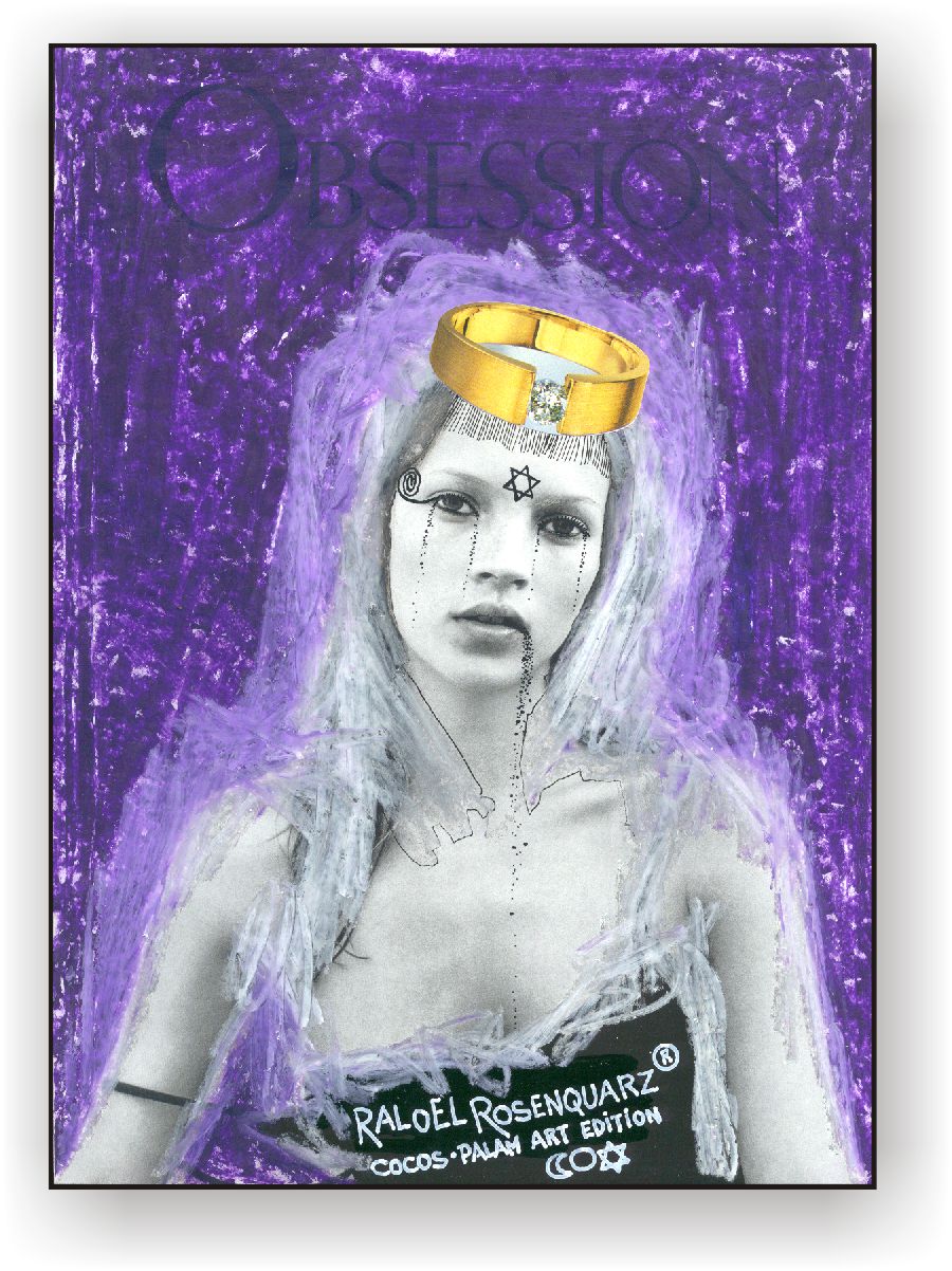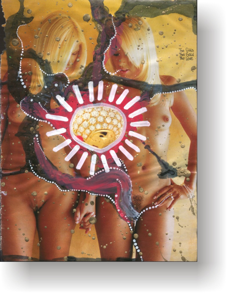 Objectbeschreibung: Originalblatt aus einem typischen Nacktmagazin Ende der 70er Jahre, bearbeitet mit Ölkreide und Lackstift, zuzüglich mehrerer Collageelemente. 30 cm auf 22 cm unsigniert, 1999