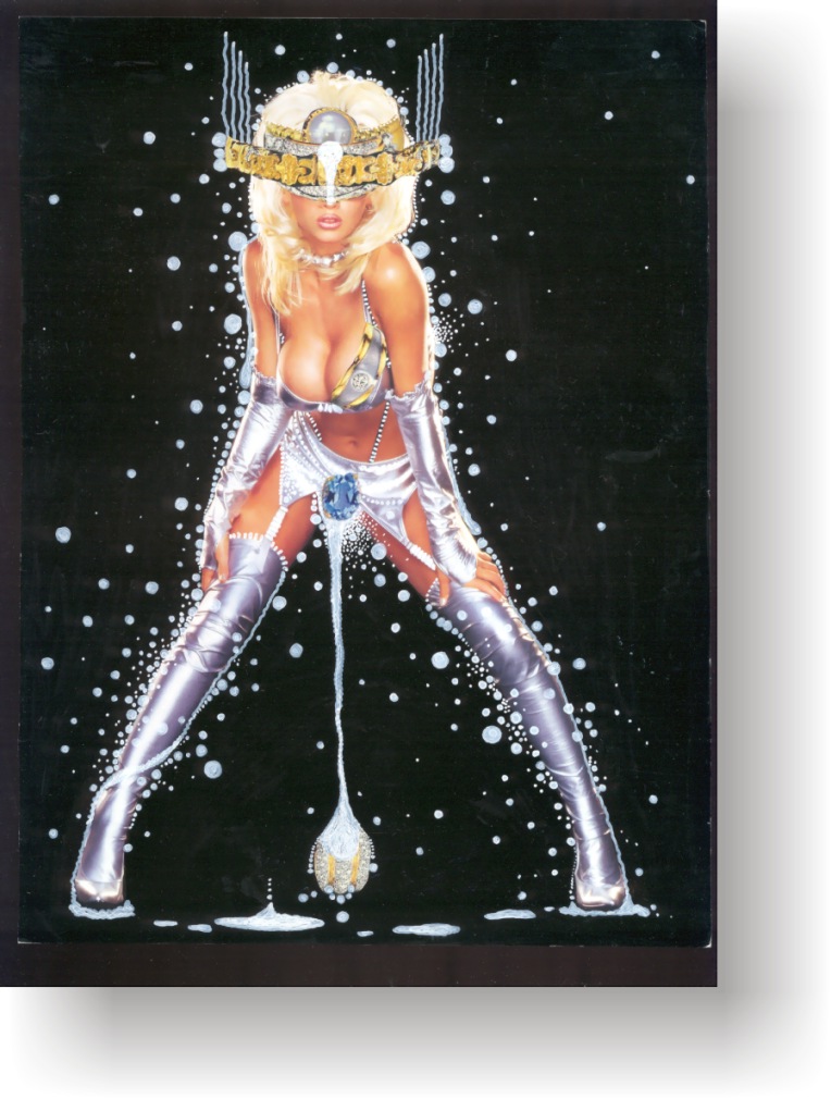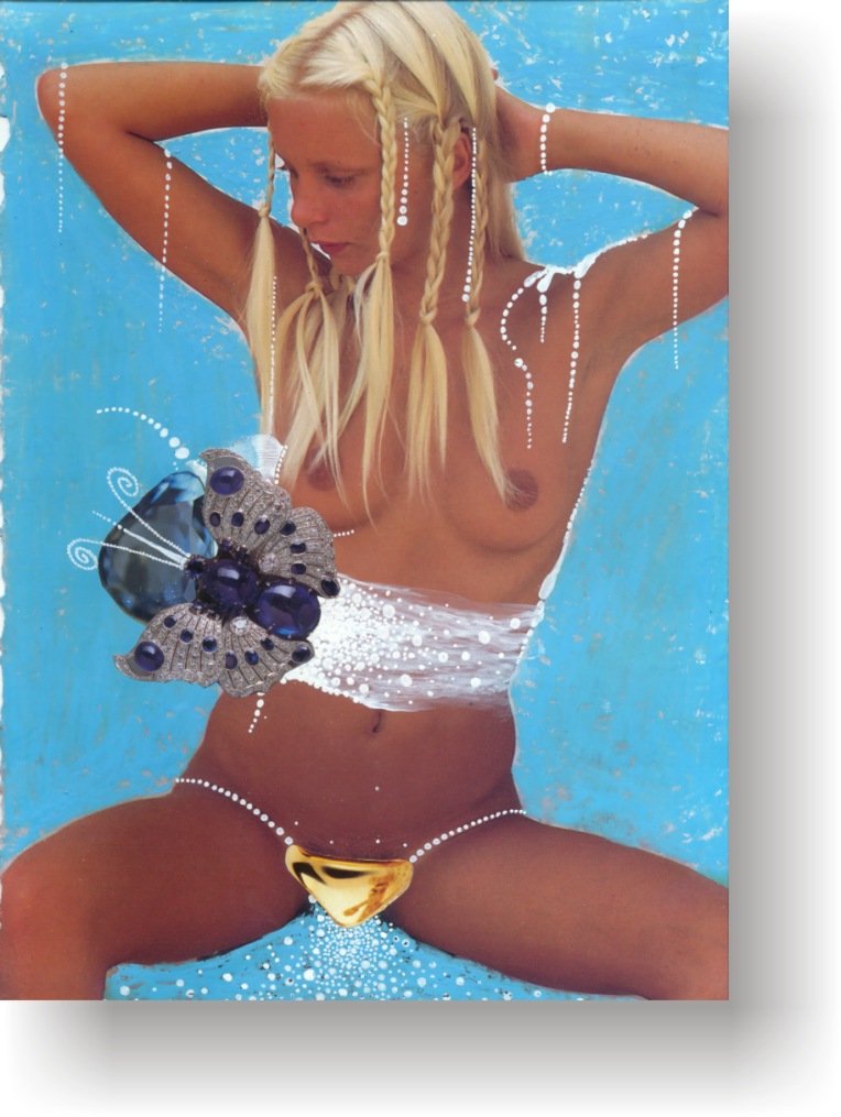 Objectbeschreibung: Originalblatt aus einem typischen Nacktmagazin Ende der 70er Jahre, bearbeitet mit verschiedenen Lackstiften und Tusche, zuzüglich mehrerer Collageelemente. 30 cm auf 20 cm unsigniert, 1999
