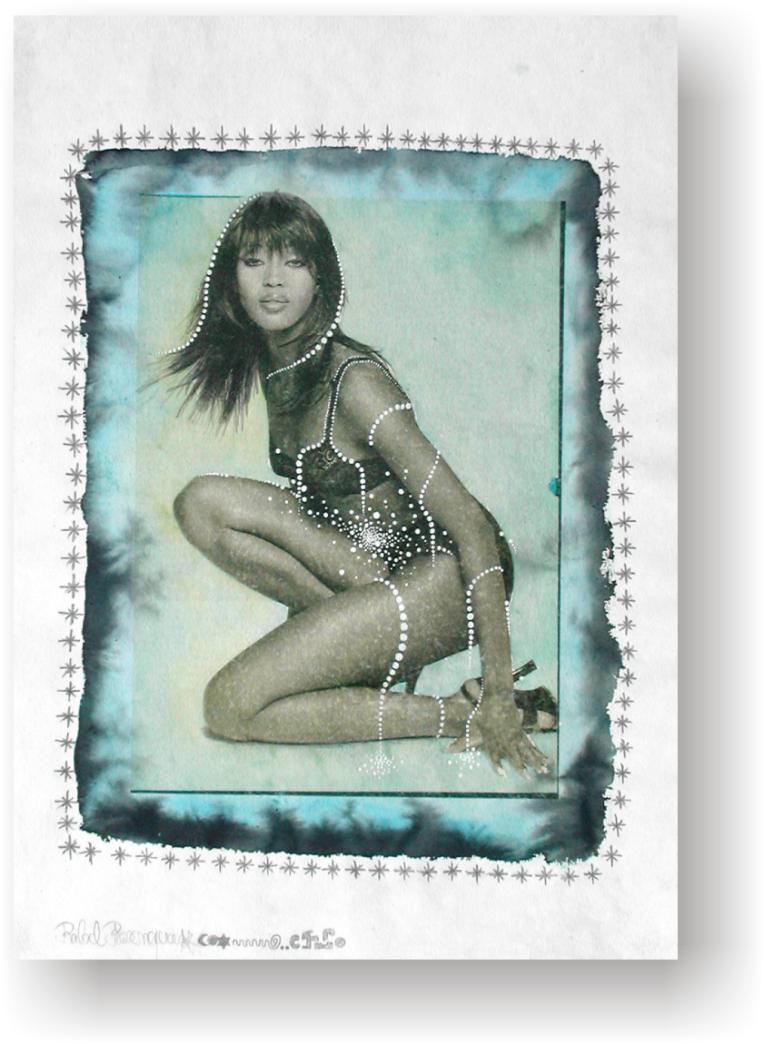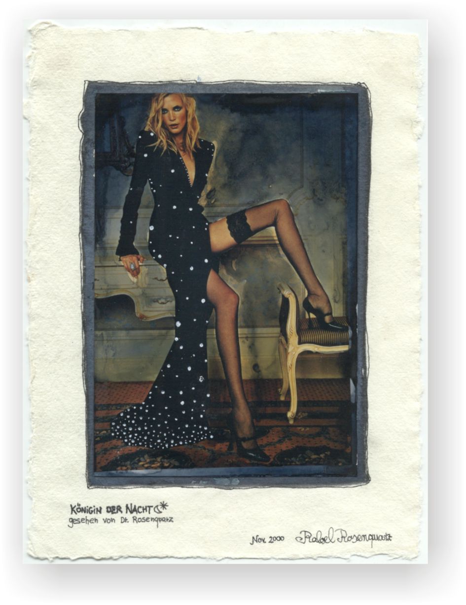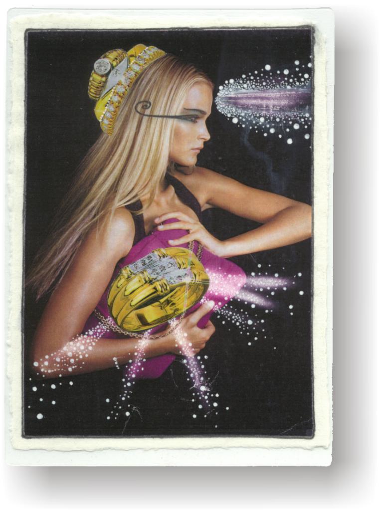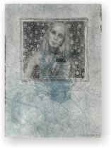 Objectbeschreibung: Verfremdeter Digitaldruck, geleimt auf Bütten und in Kunststoff eingeschweißt. 21,5 cm auf 15,5 cm signiert auf Rückseite, 2000