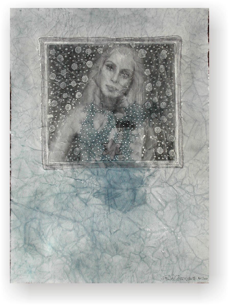 Objectbeschreibung: Bleistift, Aquarellfarbe, Lackstift und Ölkreide mit Digitaldruck auf Büttenpapier. (handgeschöpftes Büttenpapier mit original Büttenrand) 41,5 cm auf 29,5 cm signiert, 11. 12. 2000