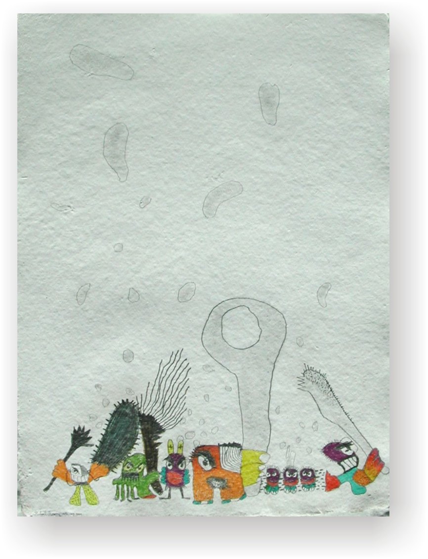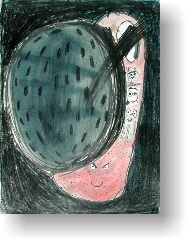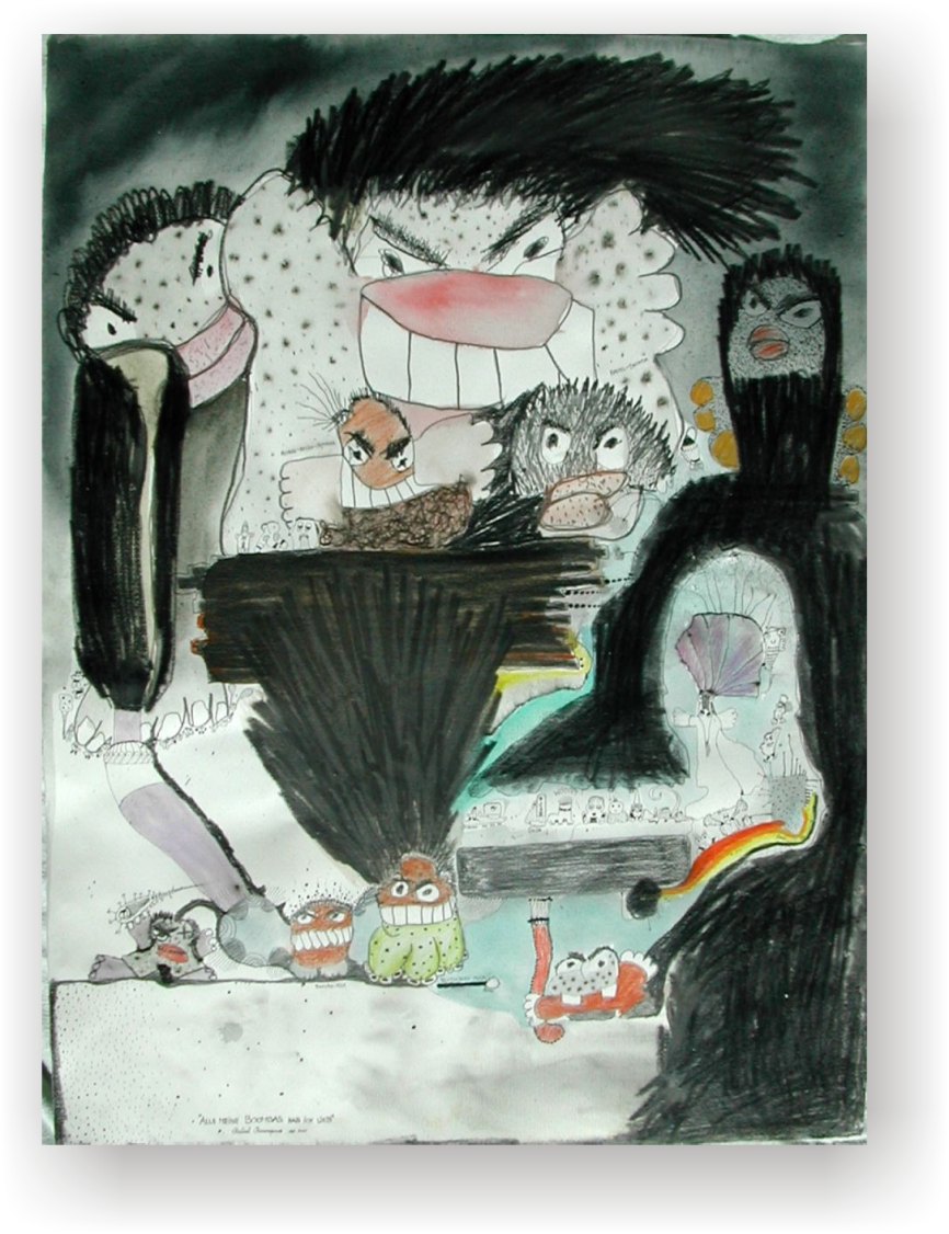 Objectbeschreibung: Wasserfarben, Tusche und Laserdruck. 29,7 cm auf 21 cm signiert, 2001