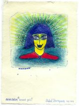 Objectbeschreibung:Laserdruck mit Buntstiften und Kugelschreiber auf Silberburg Bütten.21 cm auf 15 cmsigniert, sep. 2004