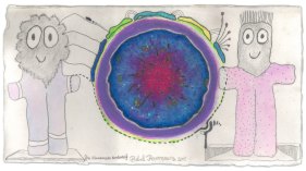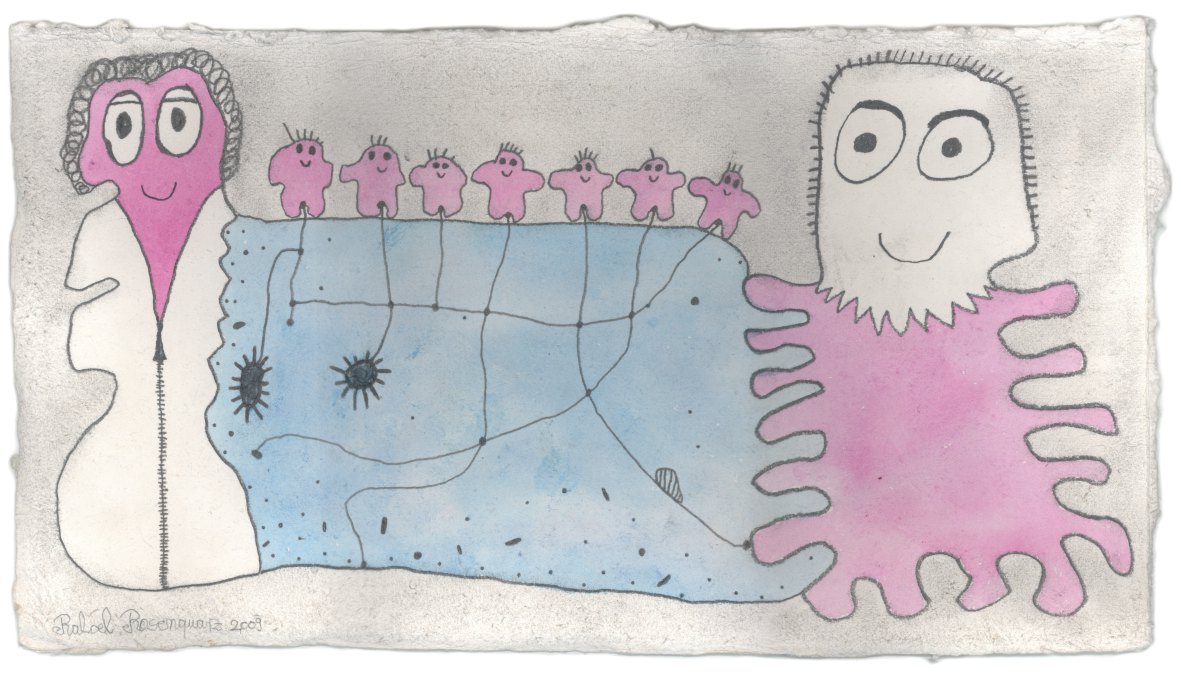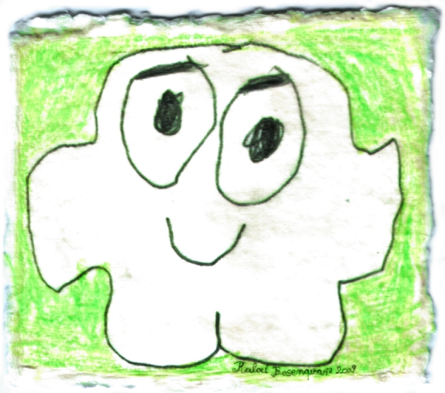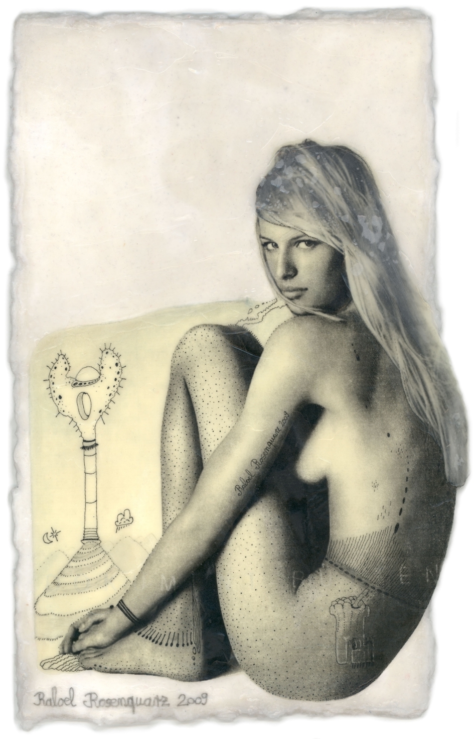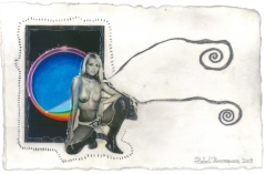 Objectbeschreibung: Aquarell, Buntstifte, Rapidograph und weißer Edding-Lackstift auf Farbkopie. Papier: Römerturm Dokumentbütten. 29,5 cm auf 42,5 cm signiert, 2009