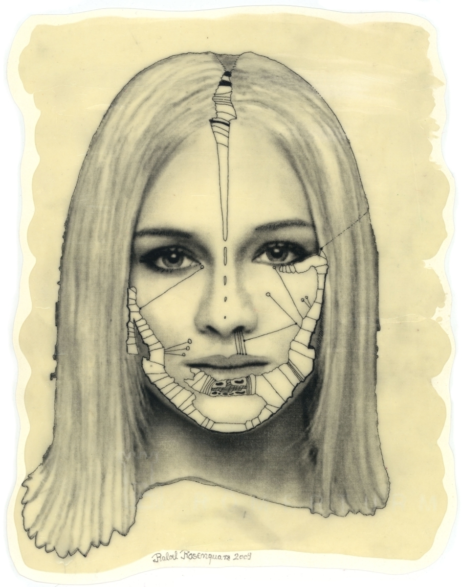 Objectbeschreibung: Bleistift, Rapidograph, Buntstifte, Lackmarker und Paper-Scratching mit artifizieller Beschädigung auf Farbkopie. Papier: Römerturm Dokumentbütten. 29,5 cm auf 42 cm signiert, 2009