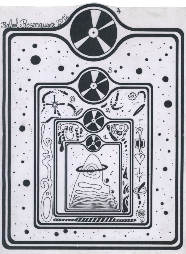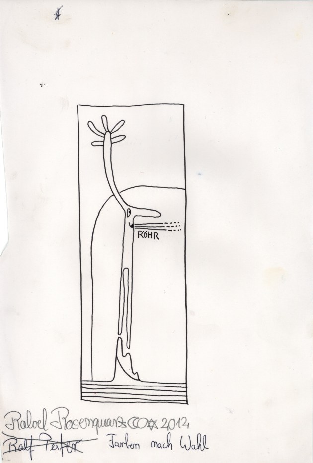 Objectbeschreibung: Bleistift, Buntstifte und Rapidograph auf Laserdruck. 17,5 cm auf 25 cm signiert, 20. Dez. 2012