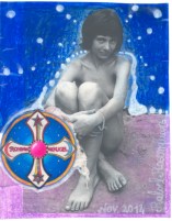 Objectbeschreibung: Wachskreide, Lackstift auf Offsetdruck mit Collageelement. 10,5 cm auf 13,5 cm signiert, Nov. 2012