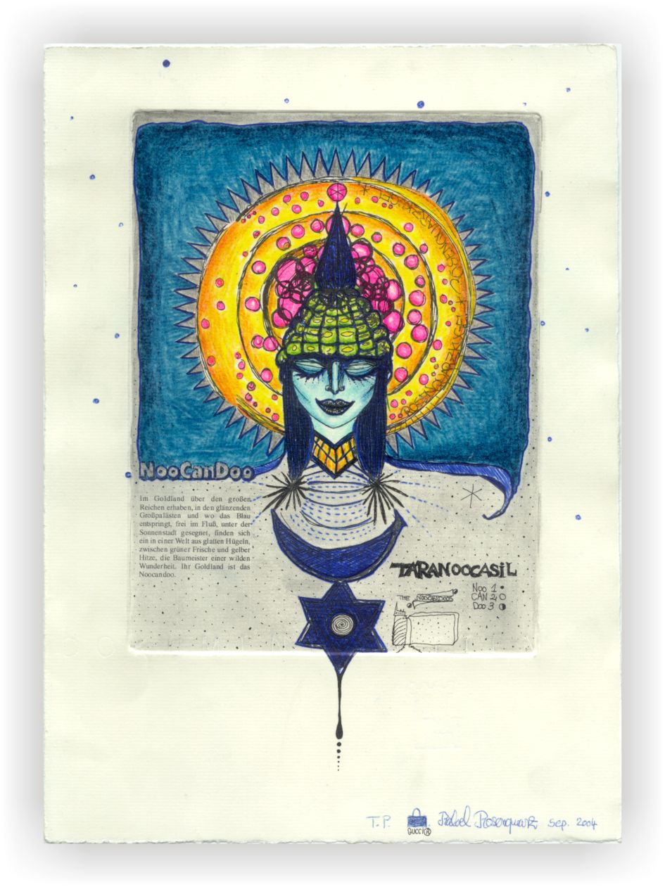 Objectbeschreibung:Komplexes Aggregat verschiedenerDrucktechniken und anderer künstlerischerAnwendungen auf Römerturm Dokumentbütten.Pseudo Graphicka (Originalstatus)29,5 cm auf 21,3 cmsigniert, Sep. 2004