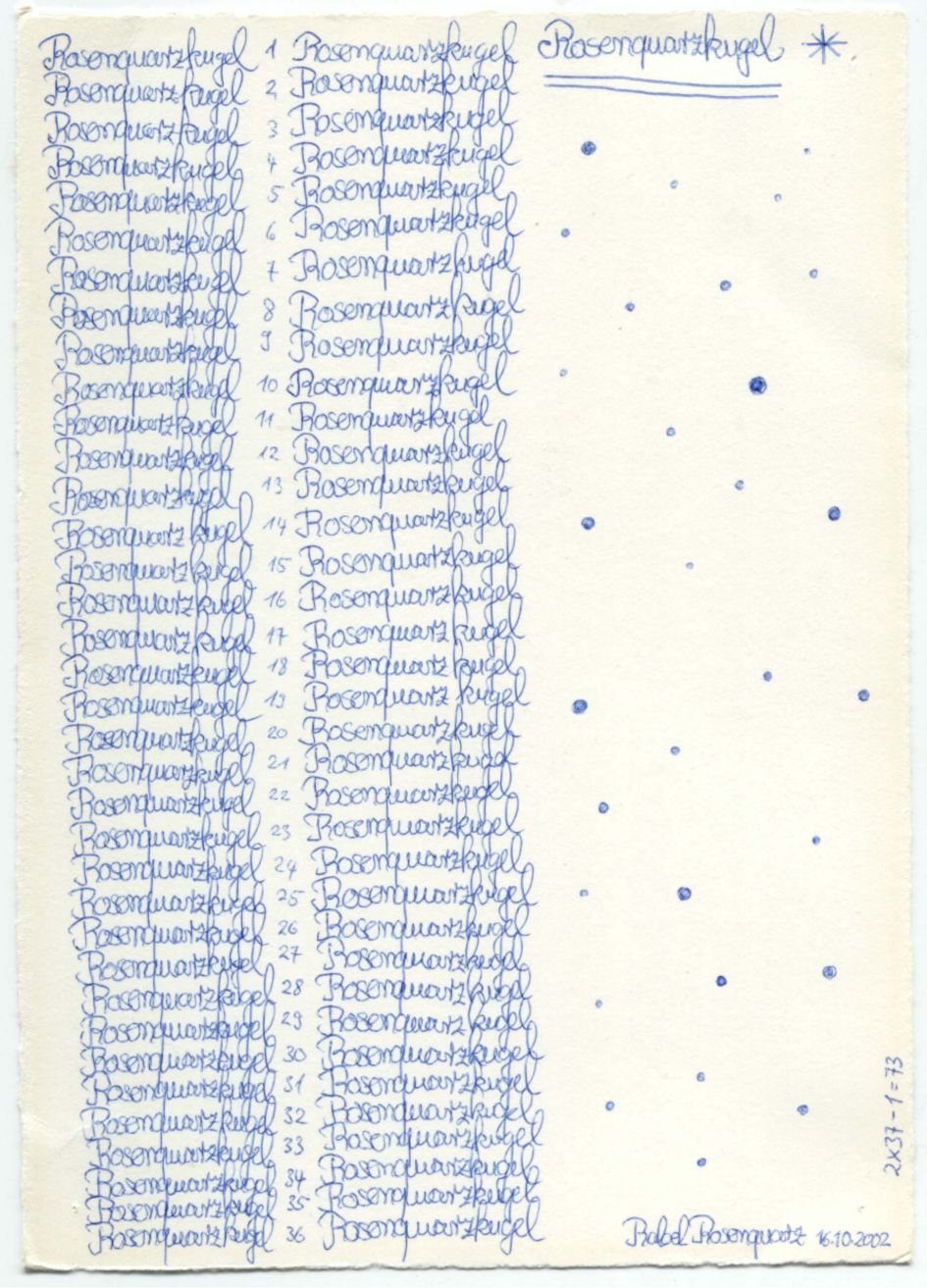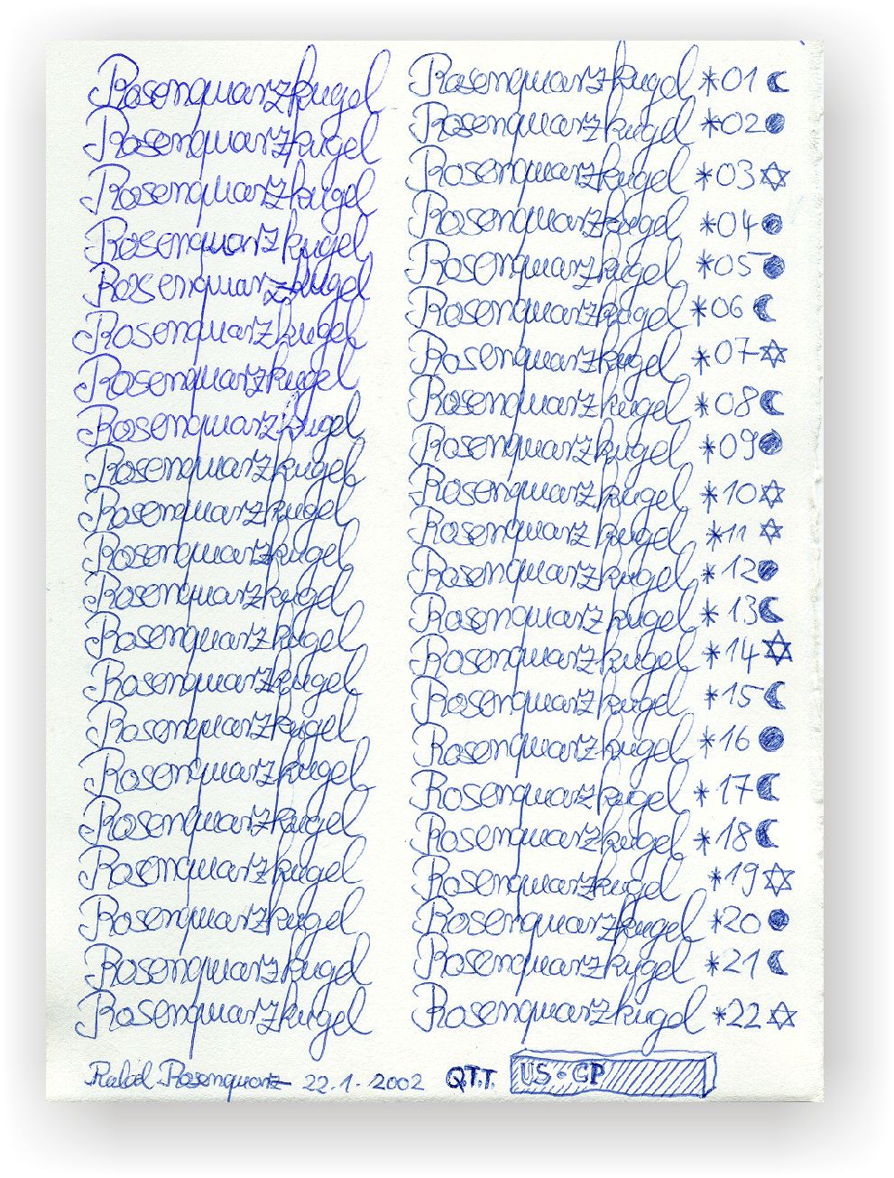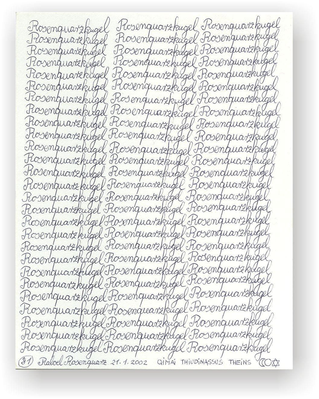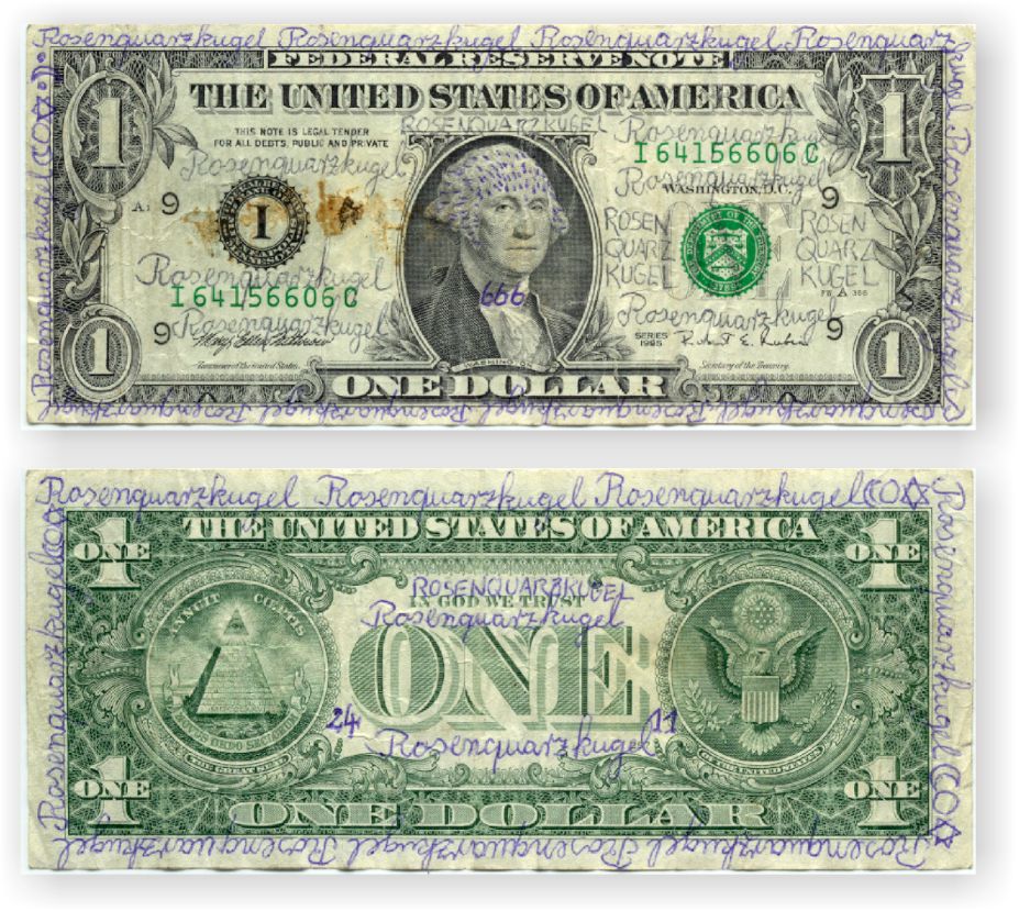 Objectbeschreibung: Mit Rosenquarzkugel beschriftete Euroscheine. Die Beschriftung wurde und wird immer noch, vom Künstler per Hand mit einem Kugelschreiber (blau, seltener rot) ausgeführt. Vorkommen: Europa unsigniert, 2002 Dieses Werk ist nicht verfügbar, da die Scheine dem Geldfluß übergeben werden. Der Wert ist unbekannt.