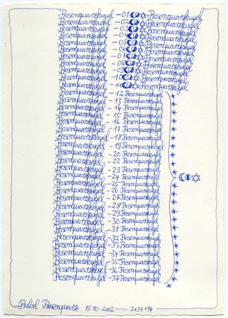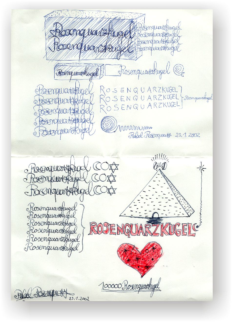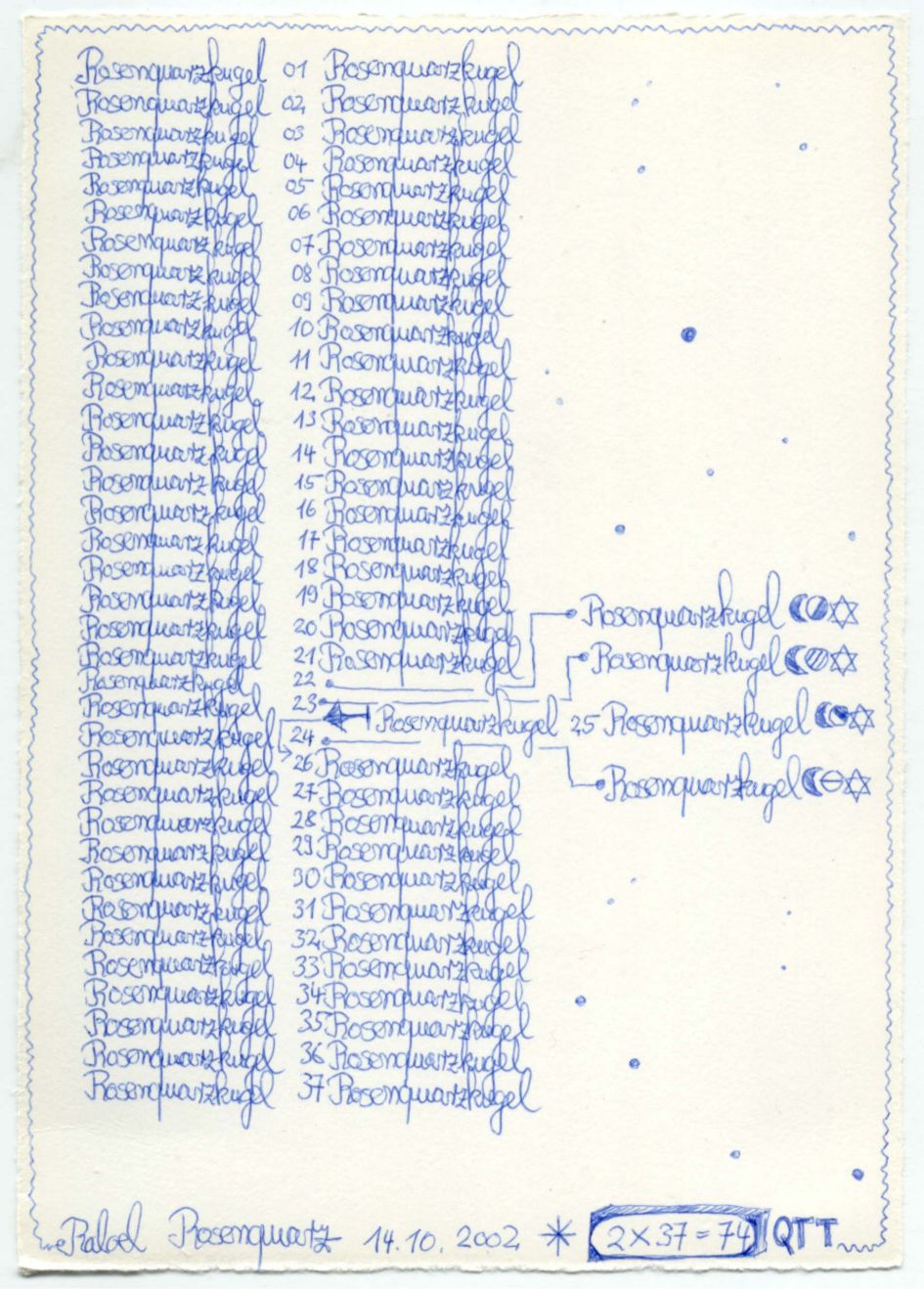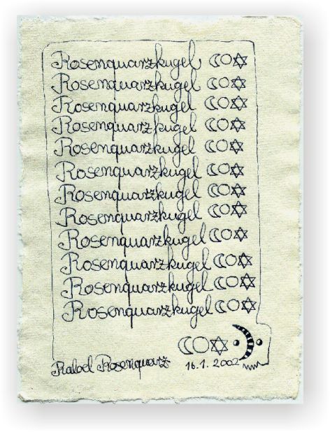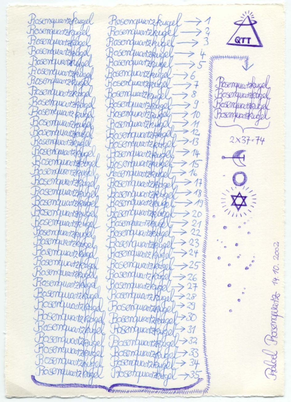 Objectbeschreibung: Mit Rosenquarzkugel beschriftete Euroscheine. Die Beschriftung wurde und wird immer noch, vom Künstler per Hand mit einem Kugelschreiber (blau, seltener rot) ausgeführt. Vorkommen: Europa unsigniert, 2002 Dieses Werk ist nicht verfügbar, da die Scheine dem Geldfluß übergeben werden. Der Wert ist unbekannt.