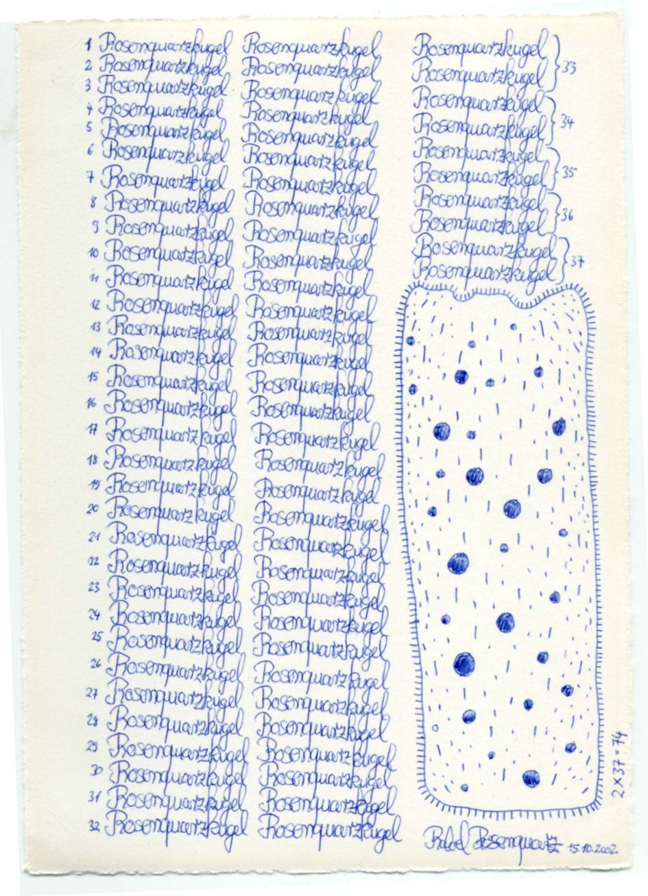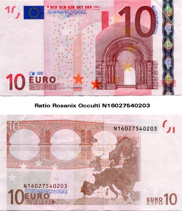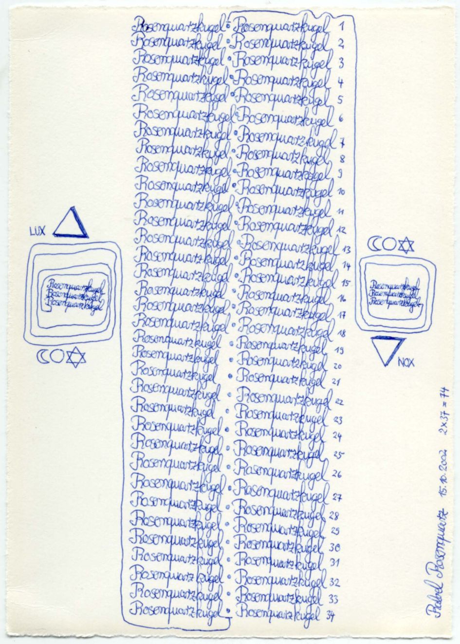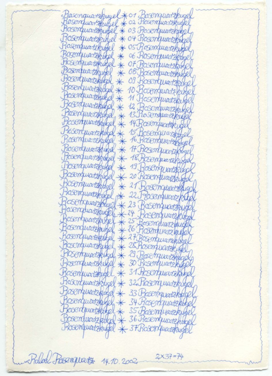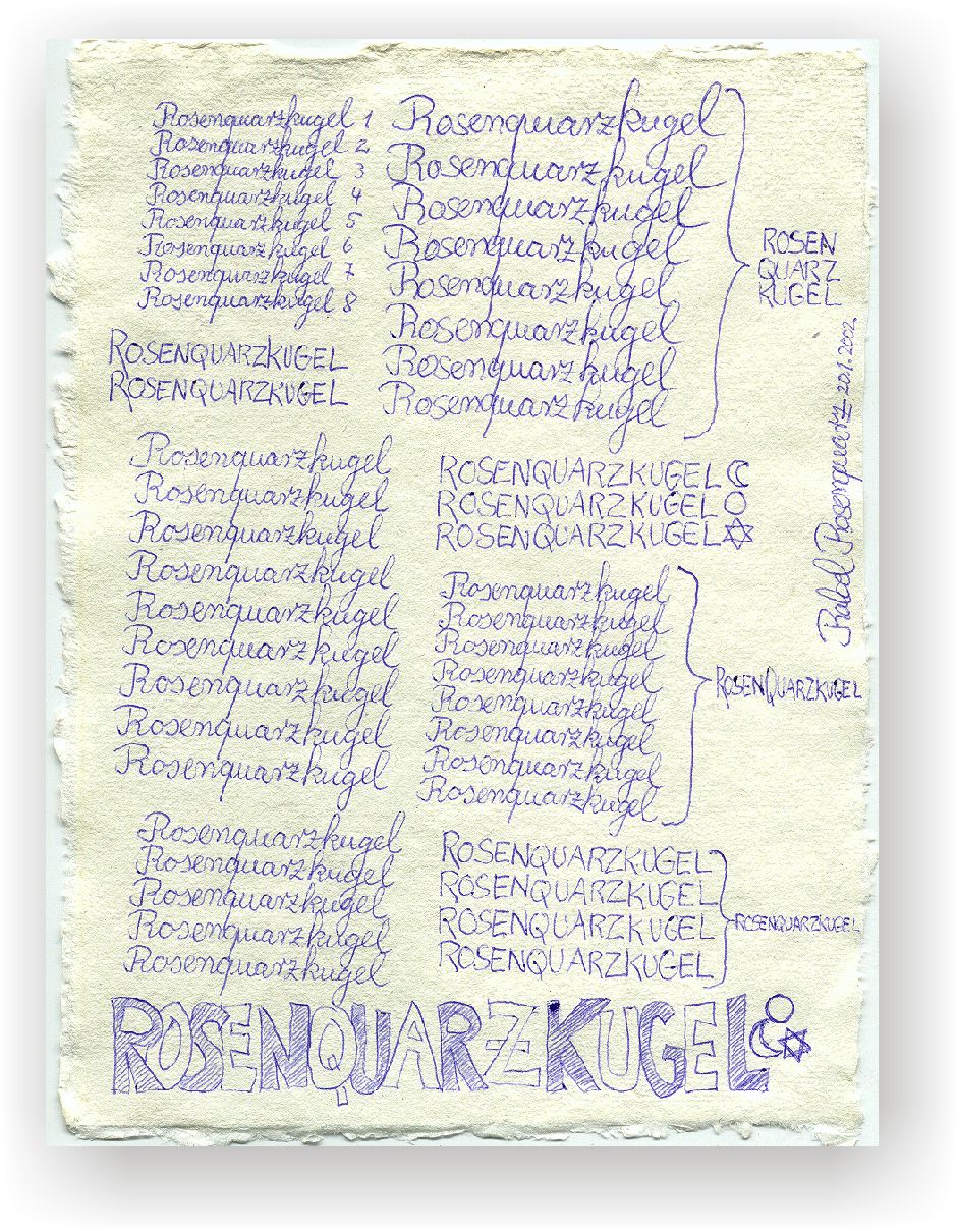 Objectbeschreibung: Mit Rosenquarzkugel beschriftete Euroscheine. Die Beschriftung wurde und wird immer noch, vom Künstler per Hand mit einem Kugelschreiber (blau, seltener rot) ausgeführt. Vorkommen: Europa unsigniert, 2002 Dieses Werk ist nicht verfügbar, da die Scheine dem Geldfluß übergeben werden. Der Wert ist unbekannt.