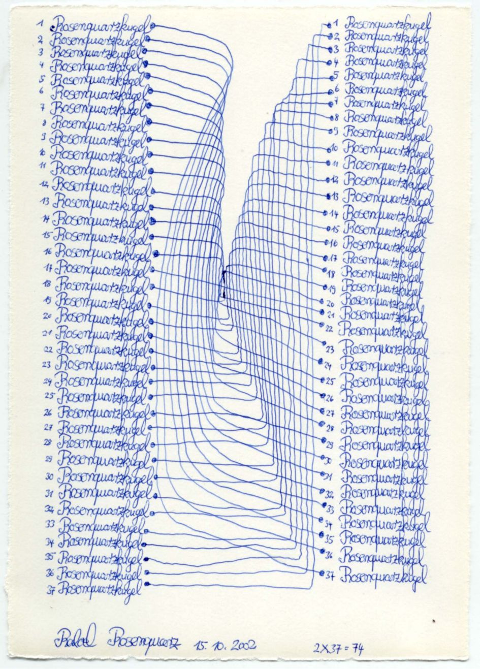 Objectbeschreibung: Kugelschreiber auf Büttenpapier. 9 Blätter zu je 21 cm auf 14,8 cm einzeln signiert, 2002 Wert: 666 RQK