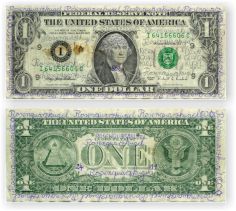 Objectbeschreibung: Kugelschreiber auf Dollar-Note. 6,6 cm auf 15,5 cm unsigniert, 19. 1. 2002 Wert: 30 RQK