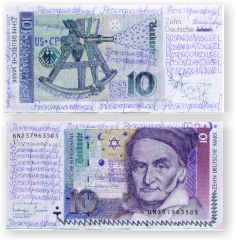 Objectbeschreibung: Kugelschreiber und Lackstift auf 10 DM Schein. 6,5 cm auf 13 cm unsigniert, 20. 1. 2002 Wert: 33 RQK