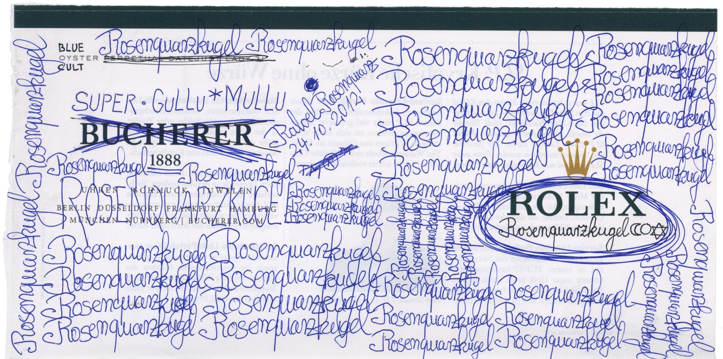 Objectbeschreibung: Rapidograph und Kugelschreiben auf Reklame. 28 cm auf 13,8 cm signiert, 24. 10. 2012 Wert: 45 RQK