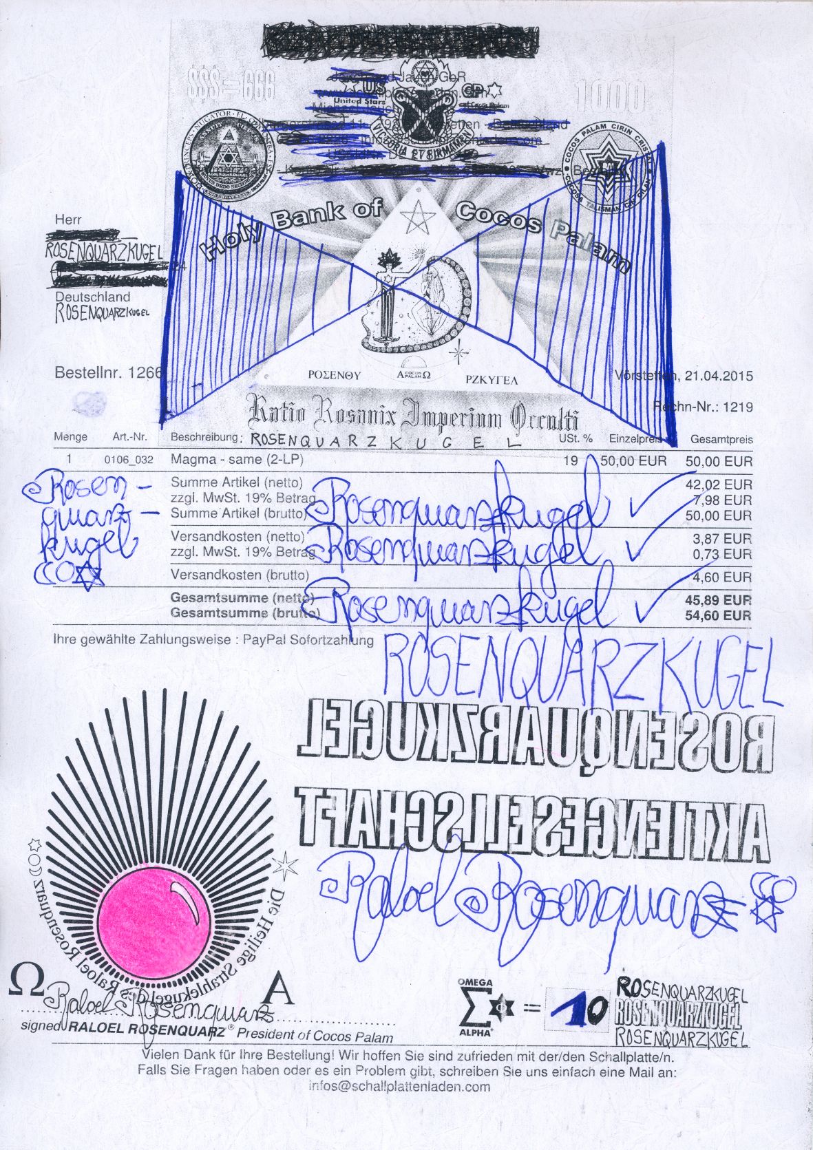 Objectbeschreibung: Buntstift und Kugelschreiber auf Rechnung mit Laserdruck, 21 cm auf 29,7 cm signiert, 2015 Wert: 10 RQK