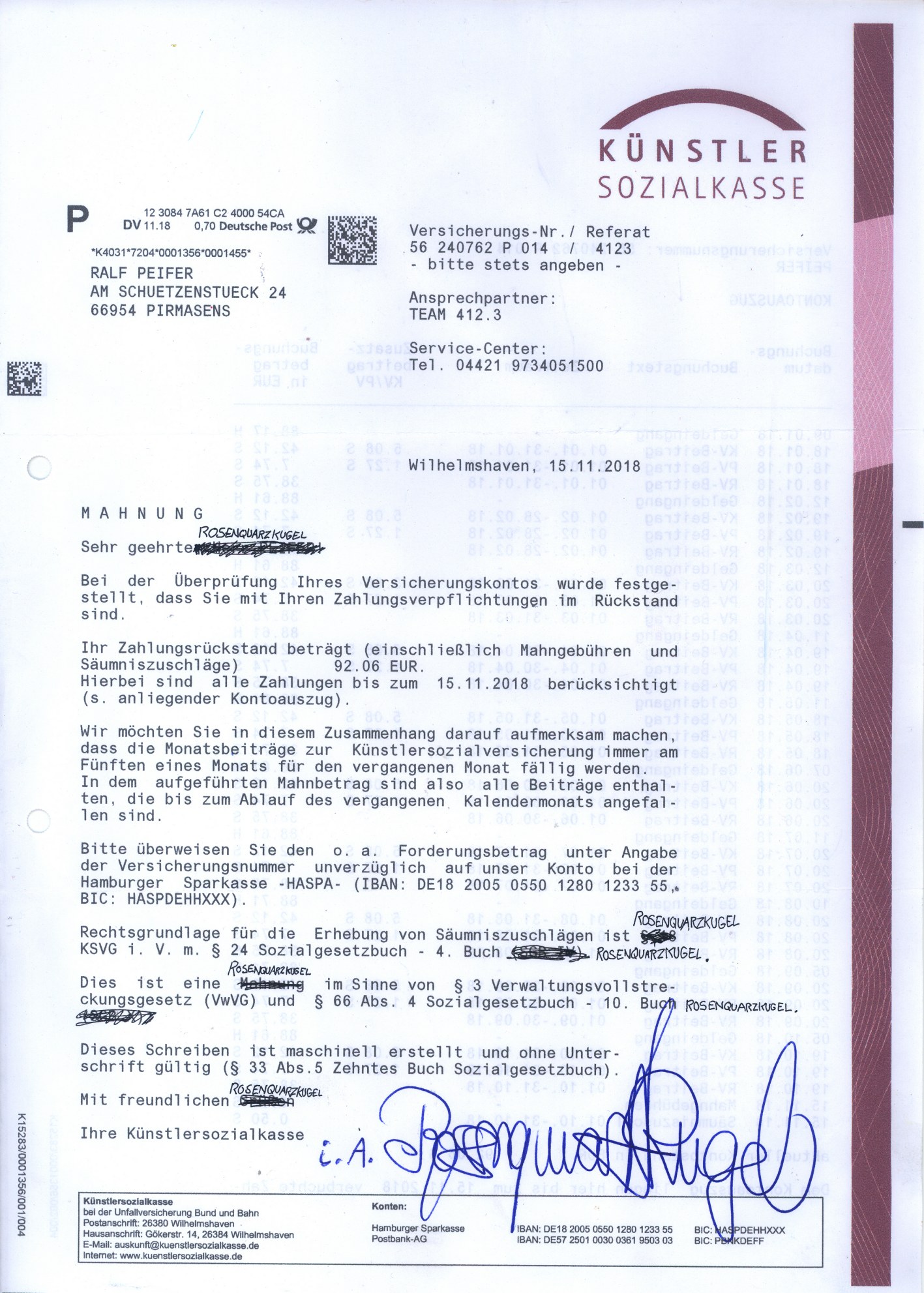 Objectbeschreibung: Buntstift, Wachskreide und Kugelschreiber auf Schreiben der Künstlersozialkasse. 21 cm auf 29,7 cm signiert, 2019 Wert: 11 RQK